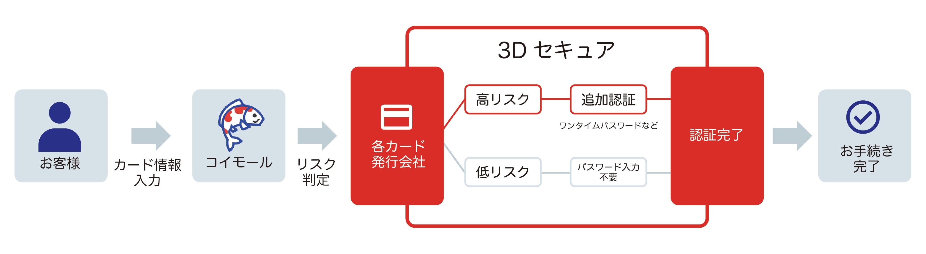 コイモールでは、安心してお買い物いただくために「3Dセキュア2.0」を導入しております。 3Dセキュアに対応していない、または登録がされていないクレジットカードは、ご利用いただけない場合があります。 お手数ですが、ご利用のカードが対応しているか事前にご確認ください。